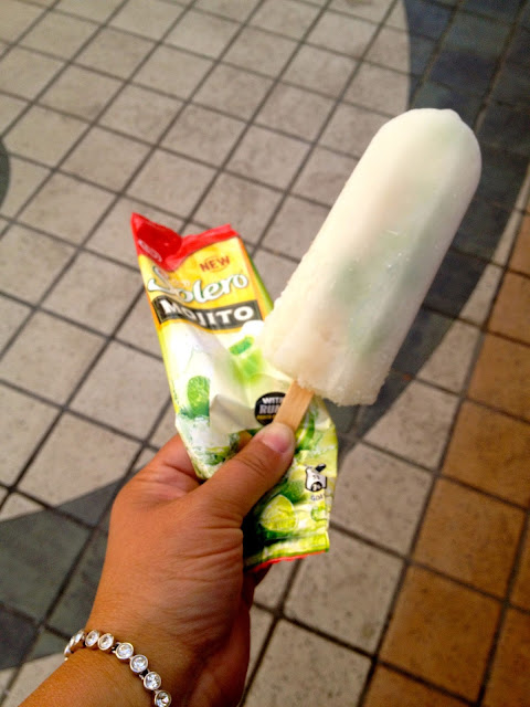 Kioskista ostettiin Mojito-jäätelöt joissa yllätykseksi oli rommia! 0,5% vain mutta aika jännä tuttavuus, myytiin vain aikuisille.Jäätelön sisällä oli jotain mintun palasia. Olipas hyvää!